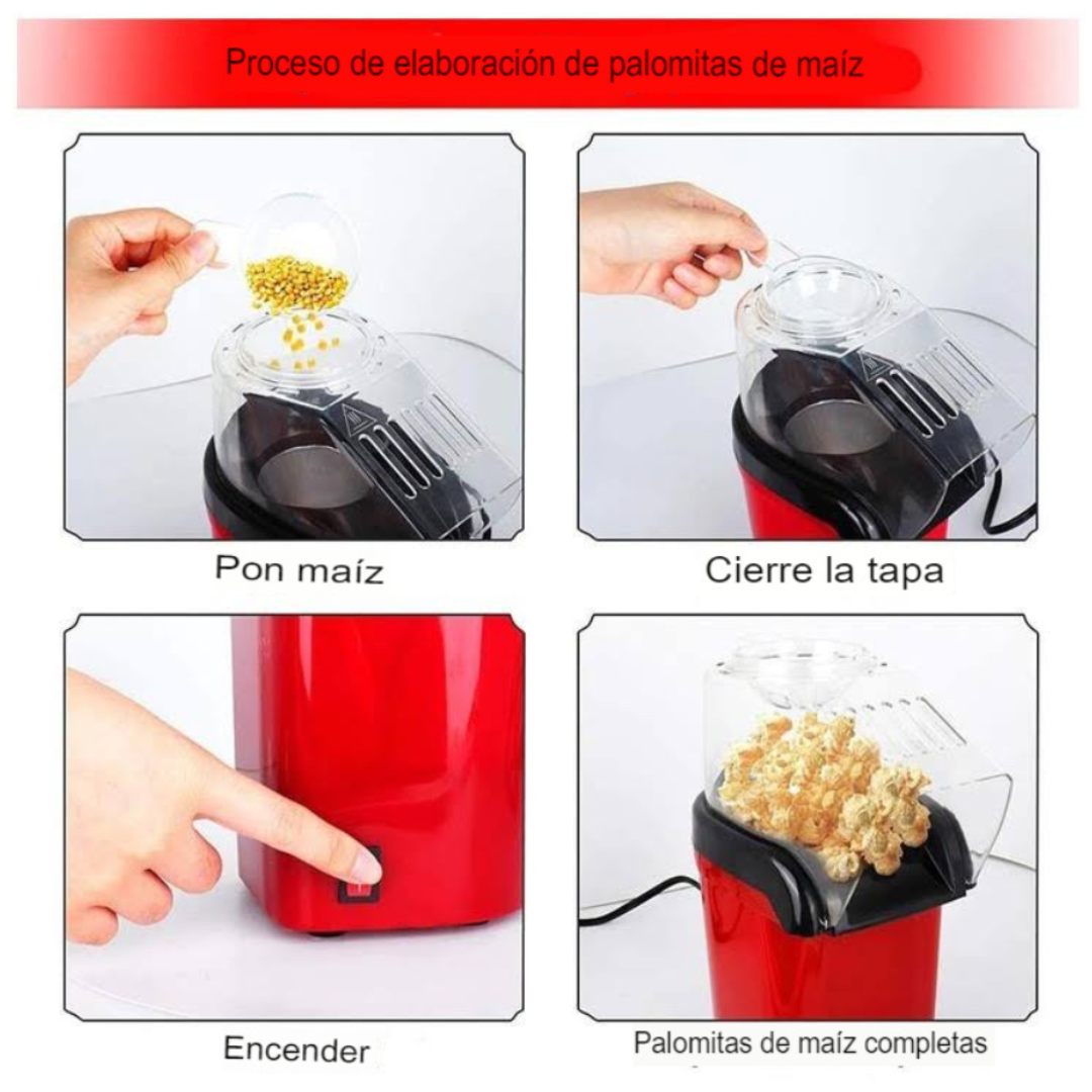 - Facilidad de uso: Solo tienes que colocar las medidas de maíz en la máquina, encenderla y esperar unos minutos. ¡Tus palomitas estarán listas para disfrutar!